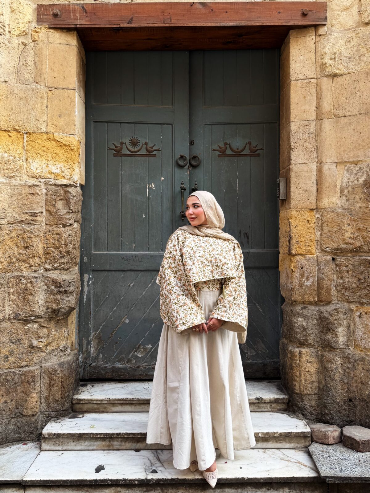 Embroidered kaftan in gold, green and orange directed like sunlight, two pieces of embroidery and a piece of a deshy dress suitable for all your time
