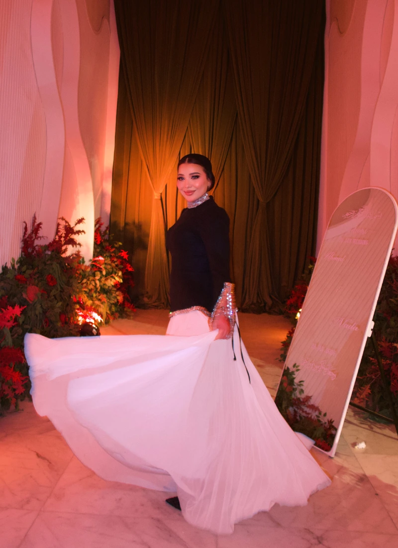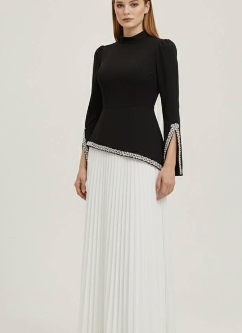 The Modaci Noir Pearl Pleated Dress is designed for women who prefer elegance with intention, not exaggeration. Featuring a structured black upper with subtle crystal detailing, this dress creates a refined contrast against a flowing white pleated skirt. The tailored bodice enhances the silhouette, while the long sleeves with delicate slit accents add a modern, graceful edge. Its high neckline delivers a polished, confident look suitable for formal evenings, elegant receptions, or sophisticated events. The pleated skirt moves effortlessly, bringing softness and balance to the structured top. This dress is about precision, harmony, and quiet luxury. Every detail is intentional, creating a piece that feels powerful yet graceful, modern yet timeless. Modaci delivers elegance that speaks softly and lasts long.
